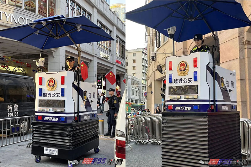 本次亮相的智能升降瞭望台集巡逻、指挥、喊话、照明、视频监控等多种功能于一体,是一座可移动的“智能升降瞭望台”。