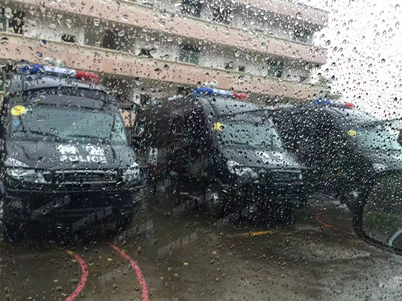 雨中庄严的反恐处突车、运警车