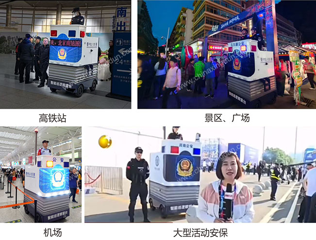 智能巡逻瞭望台主要由电动驱动系统、升降装置、瞭望工作台、集成柜以及遮阳伞等部分构成。它具备放置多种警用装备的功能,如抓铺器、盾牌、警用围挡以及警用水壶等。根据配置需求可配置全景摄像头或双镜头带云台人车侦测功能,4G 连接公安平台。智能巡逻瞭望台对提升公安执勤的灵活性与机动性强,其升降功能可以实现站的高、看的远、传的快。在大型活动、突发事件或日常巡逻任务开展过程中,它能够迅速被部署至关键位置,进而及时响应并处理各类情况,有力成为公安新的战斗力。应用于机场、高铁站、地铁、边防站、广场、景区、繁华街道等人员密集场所。